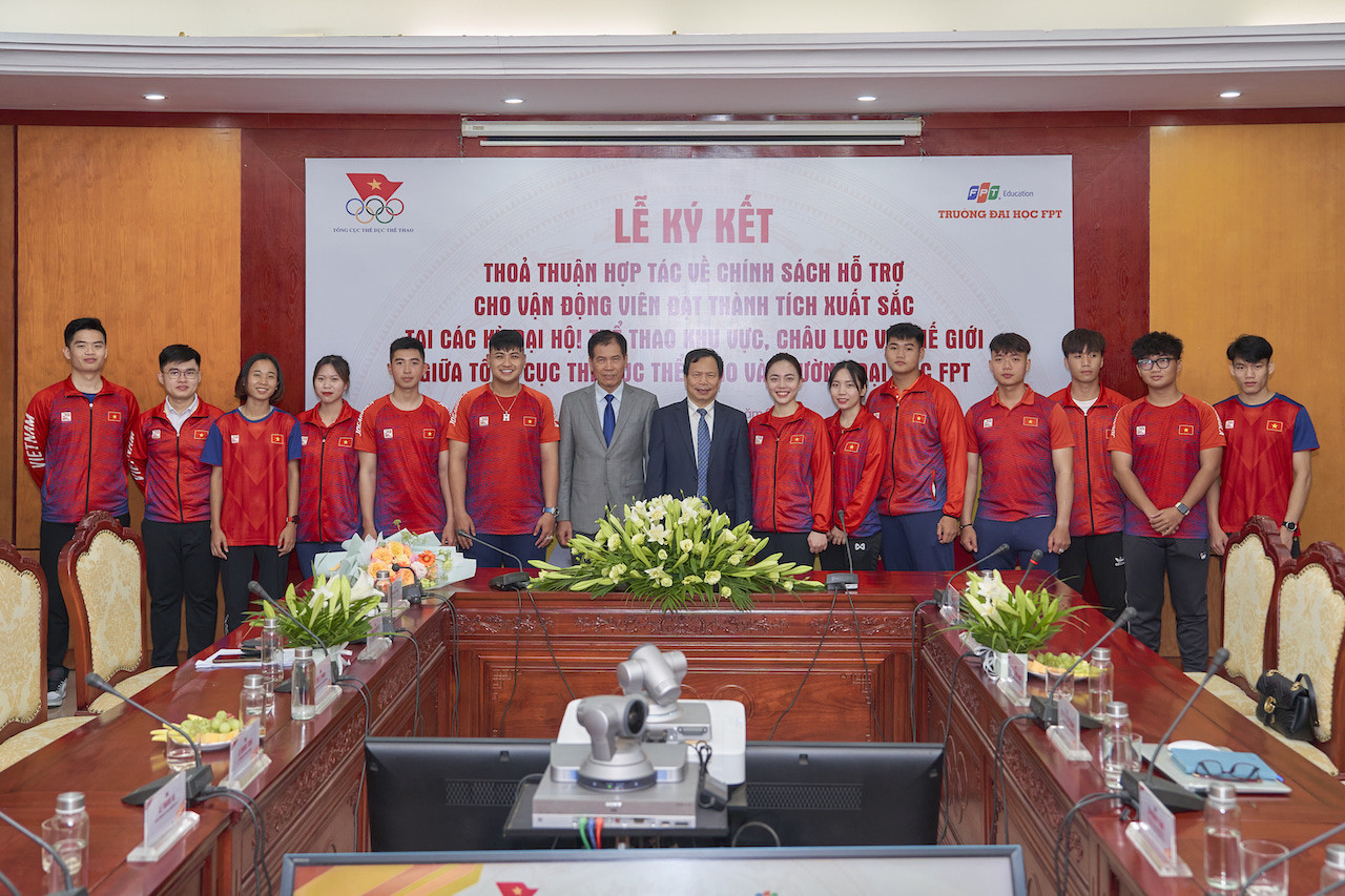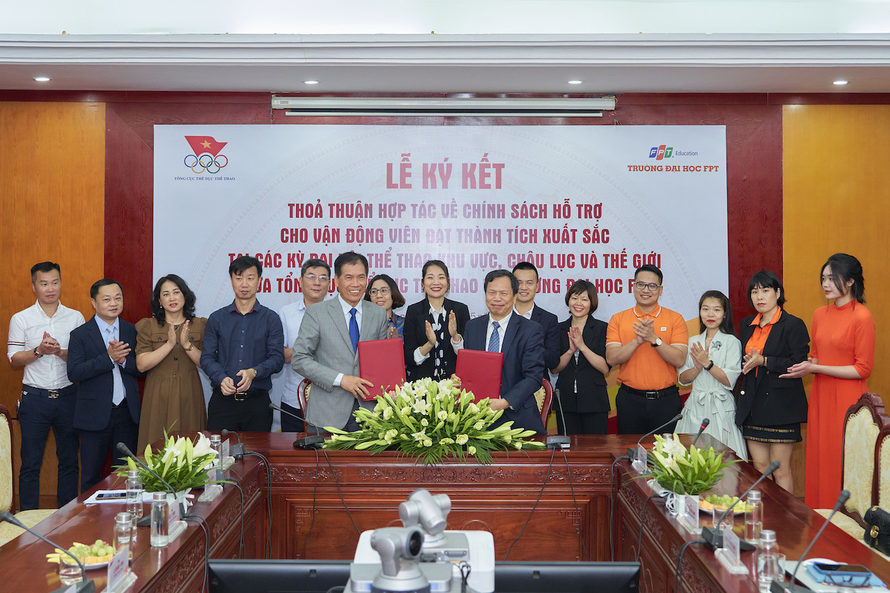 Lễ ký kết thoả thuận hợp tác về chính sách hỗ trợ cho VĐV đạt thành tích xuất sắc tại các kỳ đại hội thể thao khu vực, châu lục và thế giới giữa Tổng cục Thể dục Thể thao và Trường Đại học FPT được tổ chức vào sáng 8/5 tại trụ sở Tổng cục Thể dục Thể thao.