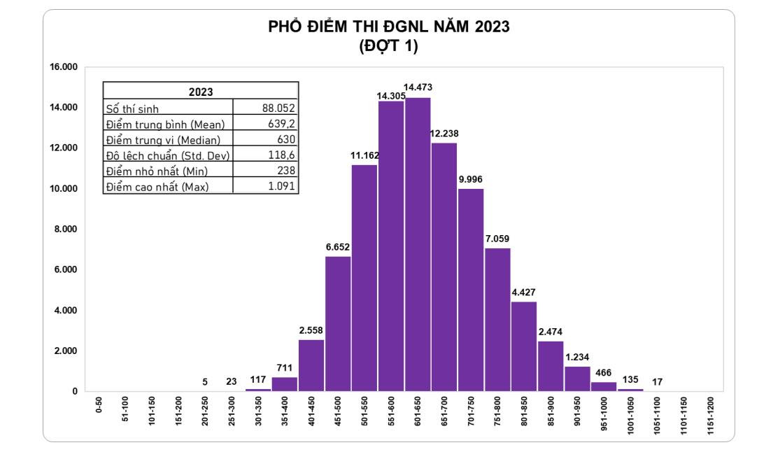 Thí sinh có điểm thi cao nhất là 1.091 điểm và thấp nhất là 238 điểm. Đánh giá về phổ điểm của đợt thi này, ông Chính nhận định: “Phổ điểm thi đợt 1 năm 2023 có dạng phân bố chuẩn và trải rộng, thể hiện khả năng phân loại thí sinh cao, thuận lợi cho công tác xét tuyển”.