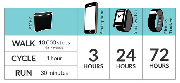 Sạc Ampy hoạt động dựa trên nguyên tắc độc đáo: thay vì phải sạc bằng cách cắm vào ổ điện thì Ampy lại sử dụng chính những năng lượng được tạo ra từ các hoạt động của cơ thể người như đi bộ, đạp xe… để nạp đầy pin. Chỉ với 10.000 bước chân (tương đương với 30 phút chạy bộ) hoặc chỉ với 1 giờ đạp xe đạp là người dùng đã có thể sạc đầy cho viên pin 1000 mAh của Ampy. Viên pin này sẽ đủ để cung cấp năng lượng cho thiết bị di động liên tục trong 3 tiếng.