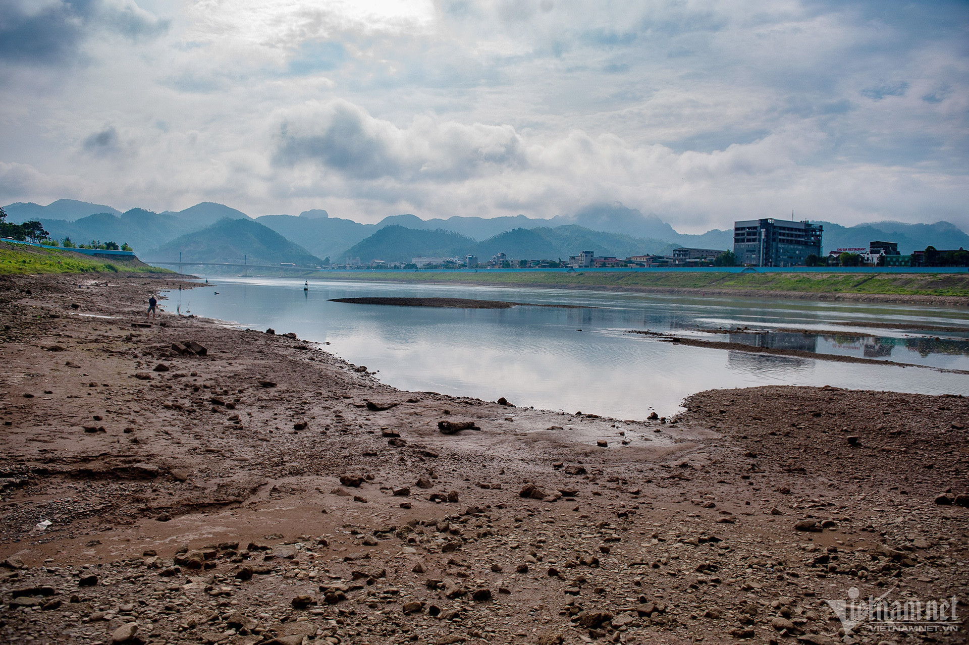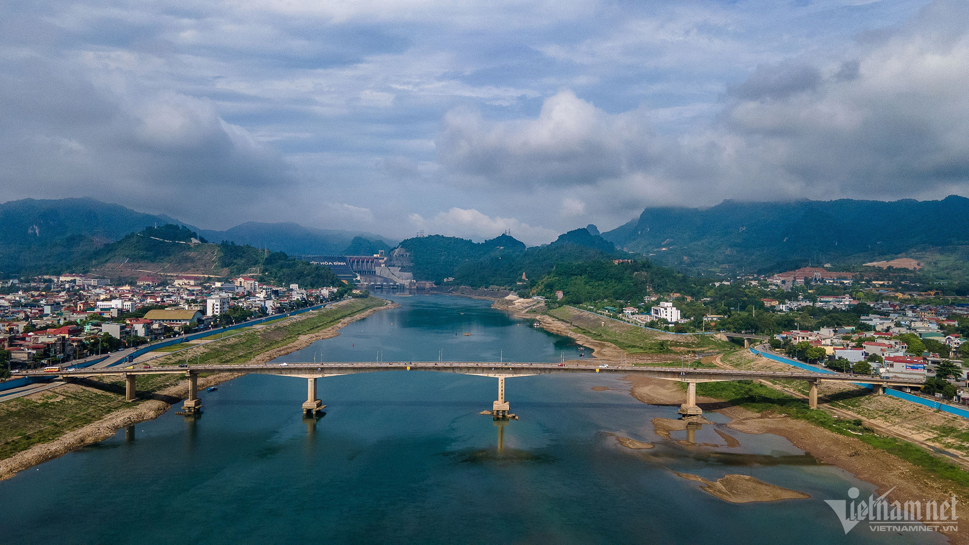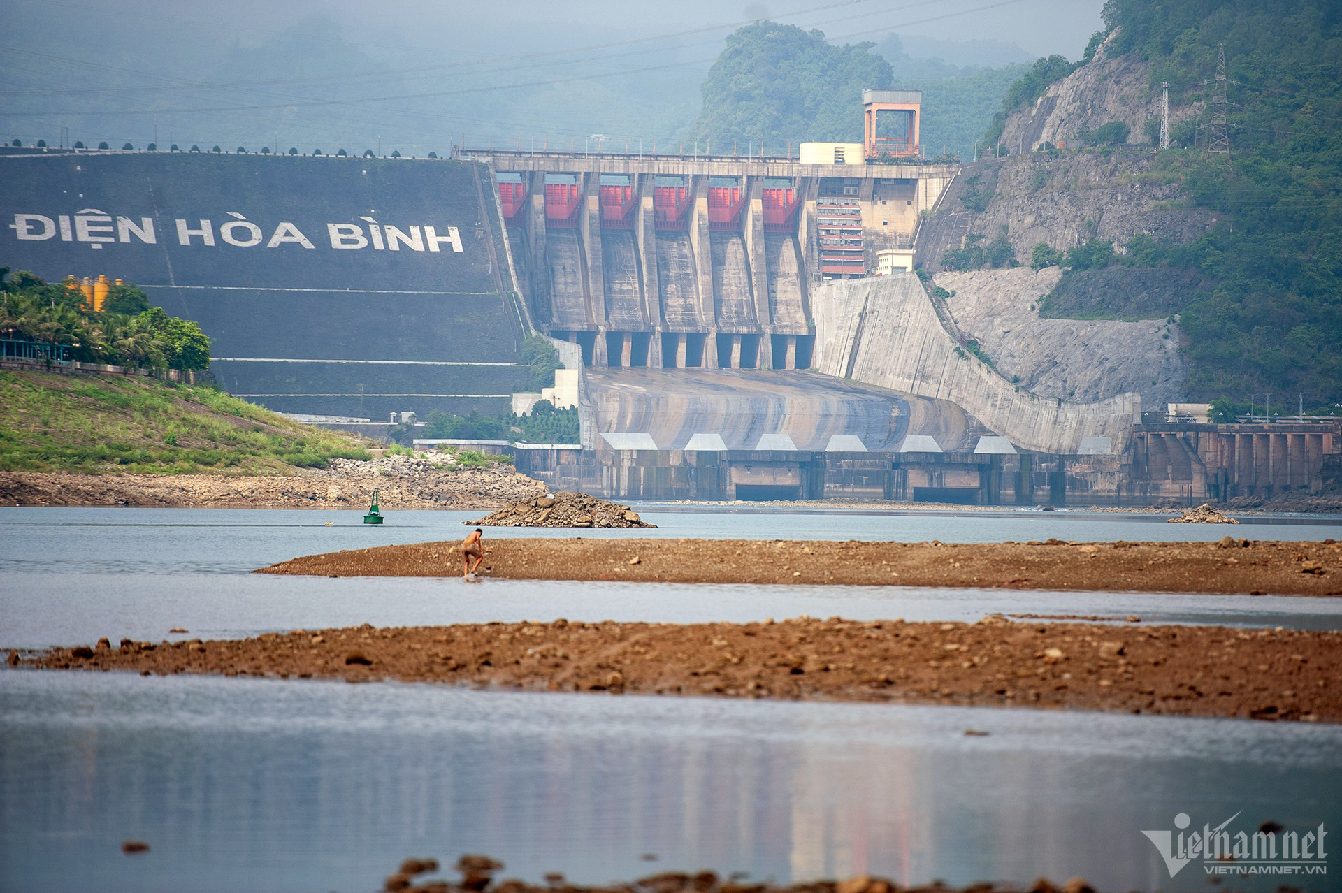 Nắng nóng kéo dài, hồ Hòa Bình tiệm cận mực nước chết. Sông Đà đoạn phía dưới chân đập thủy điện Hòa Bình nước cạn trơ đáy, nhiều tàu bè nằm bất động.