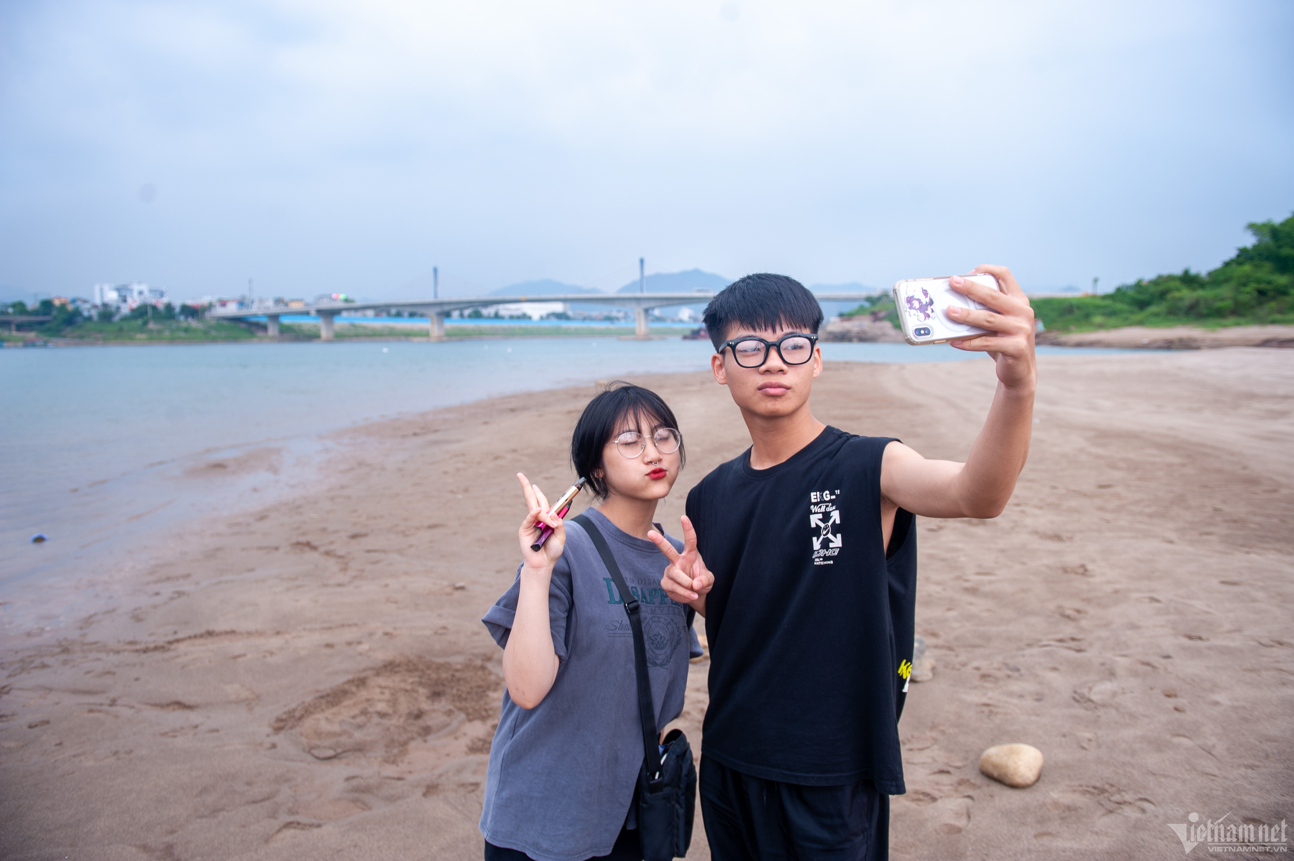 Dạo chơi cùng bạn, Nguyễn Huyền (20 tuổi) chia sẻ: "Đã từ rất lâu em mới thấy lòng sông Đà cạn như vậy, những bãi cát dài như bãi biển, nước nông và mát".