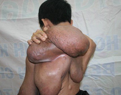 Những khối bướu này không gây đau đớn mà chỉ gây khó khăn cho việc vận động, sinh hoạt thường ngày. Do không được điều trị nên lâu dần, cánh tay trái của Vũ đã không thể cử động được do khối bướu quá nặng. Mặt khác, sự phát triển của nó khiến các dây thần kinh bị chèn ép. Bên cạnh đó, lồng ngực trái của Vũ cũng bị biến dạng, cơ thể luôn bị lệch về một bên.