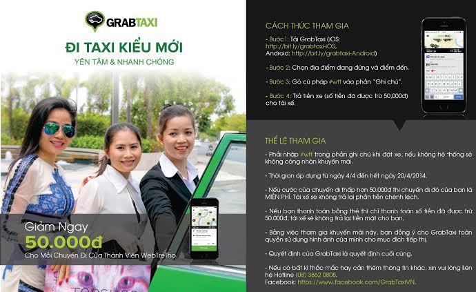 Cụ thể, khách hàng khi đặt xe qua ứng dụng GrabTaxi (người dùng iPhone có thể tải ứng dụng này về cài đặt trên máy của mình tại địa chỉ: http://bit.ly/GrabTaxi-iOS, và dùng Android tải về cài đặt tại địa chỉ: http://bit.ly/GrabTaxi-Android), sẽ được giảm trực tiếp 50.000 đồng/chuyến và không giới hạn số chuyến trong ngày. Chương trình này sẽ kéo dài đến hết ngày 20/4/2014. Và để được áp dụng chương trình khuyến mãi này, khi đặt xe, ở phần ghi chú trong ứng dụng người dùng phải ghi vào cú pháp “#wtt”.