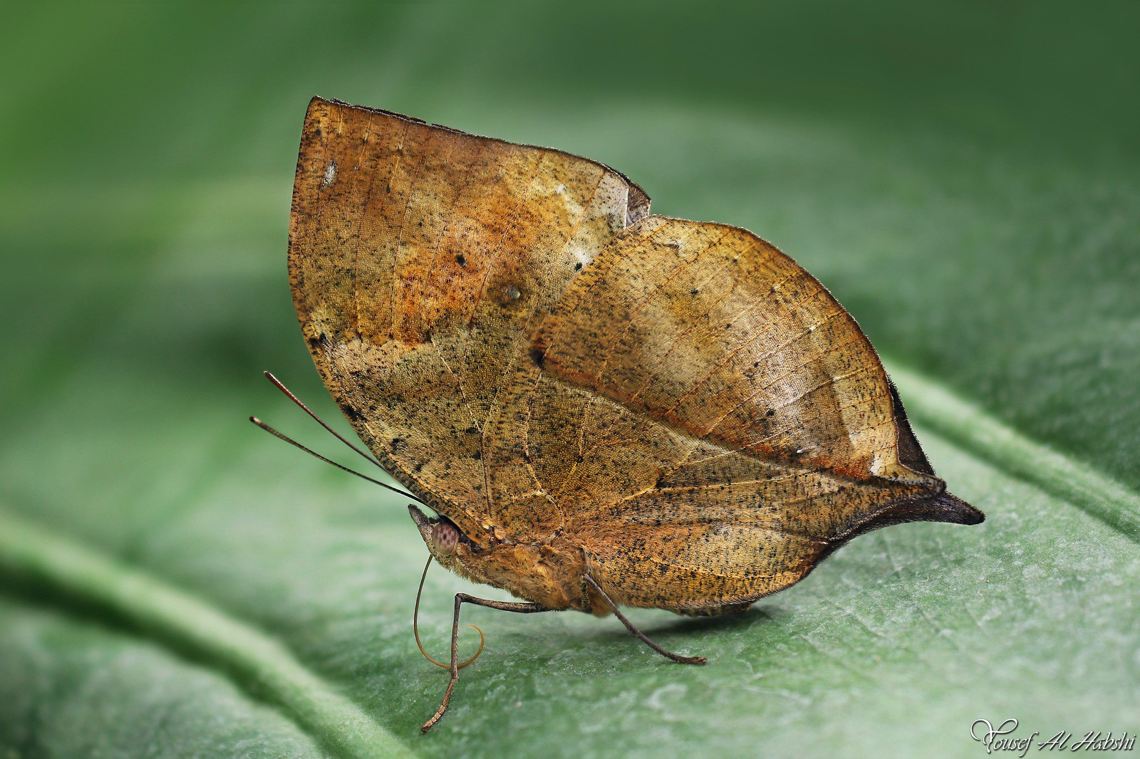 Khi nó khép cánh lại, chỉ có thể nhìn thấy các dấu hiệu bên dưới, bao gồm các hoa văn và đường vân không đều với nhiều sắc thái màu be, nâu, vàng và đen. Nó thậm chí còn có những đốm trắng, chấm đen và đốm giống như nấm mốc hoặc địa y, rất phổ biến trên những chiếc lá héo úa ở vùng nhiệt đới.