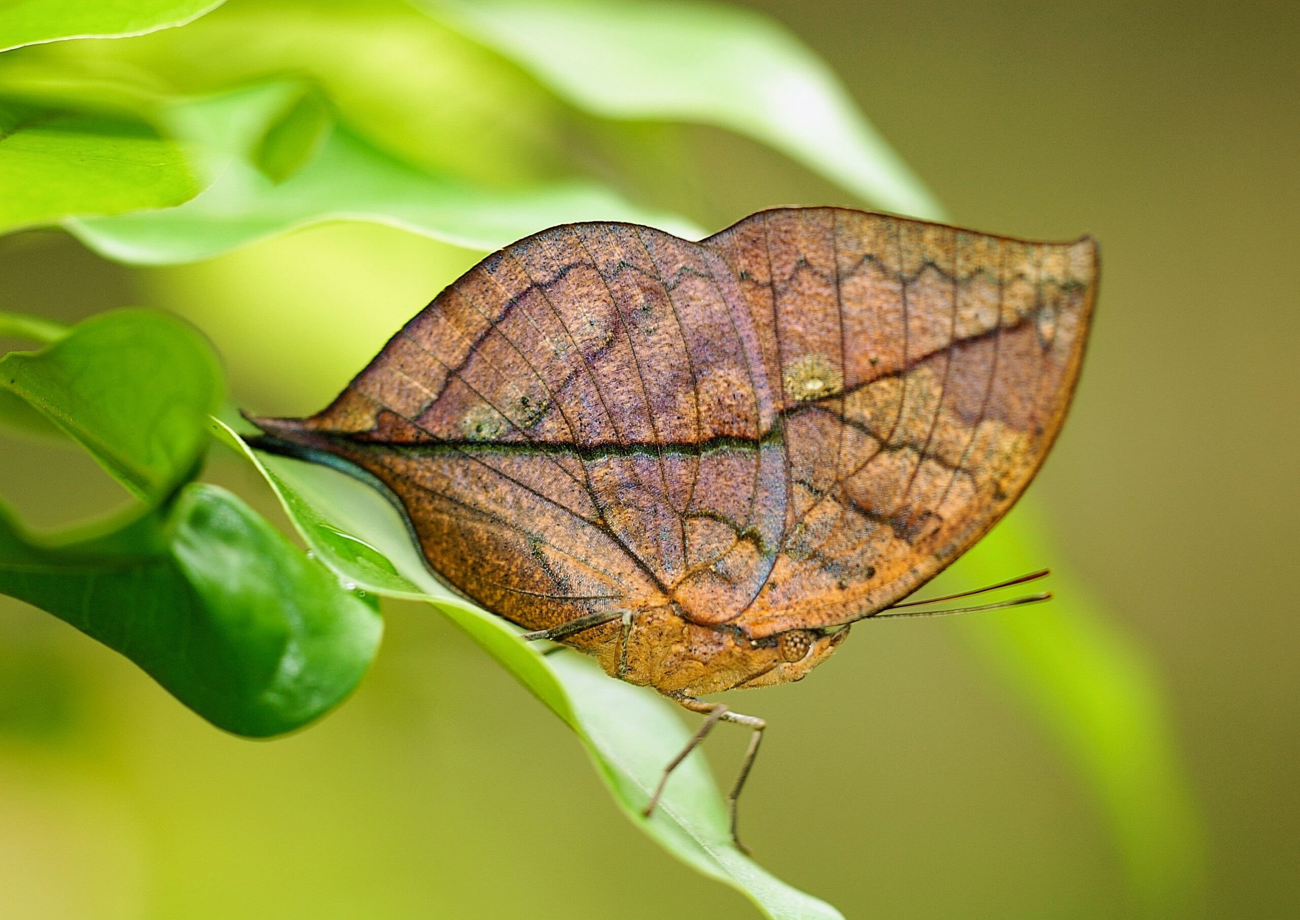 Ở vị trí này, con bướm trông giống như một chiếc lá khô, ngụy trang hoàn hảo khỏi kẻ thù tự nhiên của nó. Lớp ngụy trang cực kỳ chân thực, với những đường gân giống như những đường gân sẫm màu của chiếc lá.
