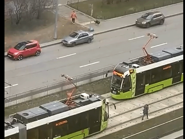 Đoàn tàu phát những tiếng còi inh ỏi nhưng cô gái trẻ dường như không nghe thấy gì nên vẫn thong thả đi bộ sát đường ray. Trong tình cảnh như vậy, tàu điện đành phải giảm tốc độ, 'bò' theo từng bước chân của cô gái.