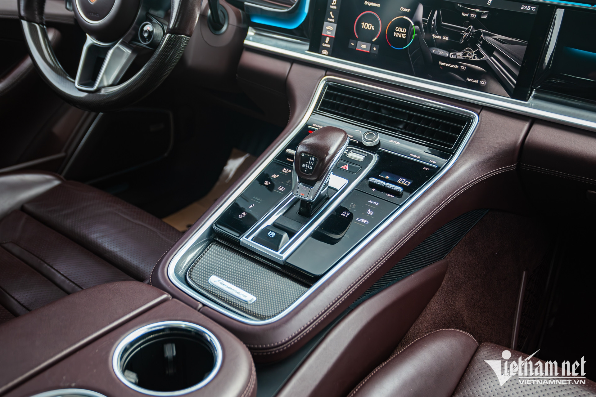 Khoang nội thất chiếc Porsche Panamera 2018 sử dụng tông màu đỏ đô chủ đạo, kết hợp cùng đường chỉ khâu màu trắng tương phản. Sau 8 năm sử dụng, ghế ngồi bọc da hay một số chi tiết đã xuất hiện dấu hiệu “lão hóa”. Vô-lăng được ốp sợi carbon, tạo nên điểm nhấn cho khoang lái của xe.