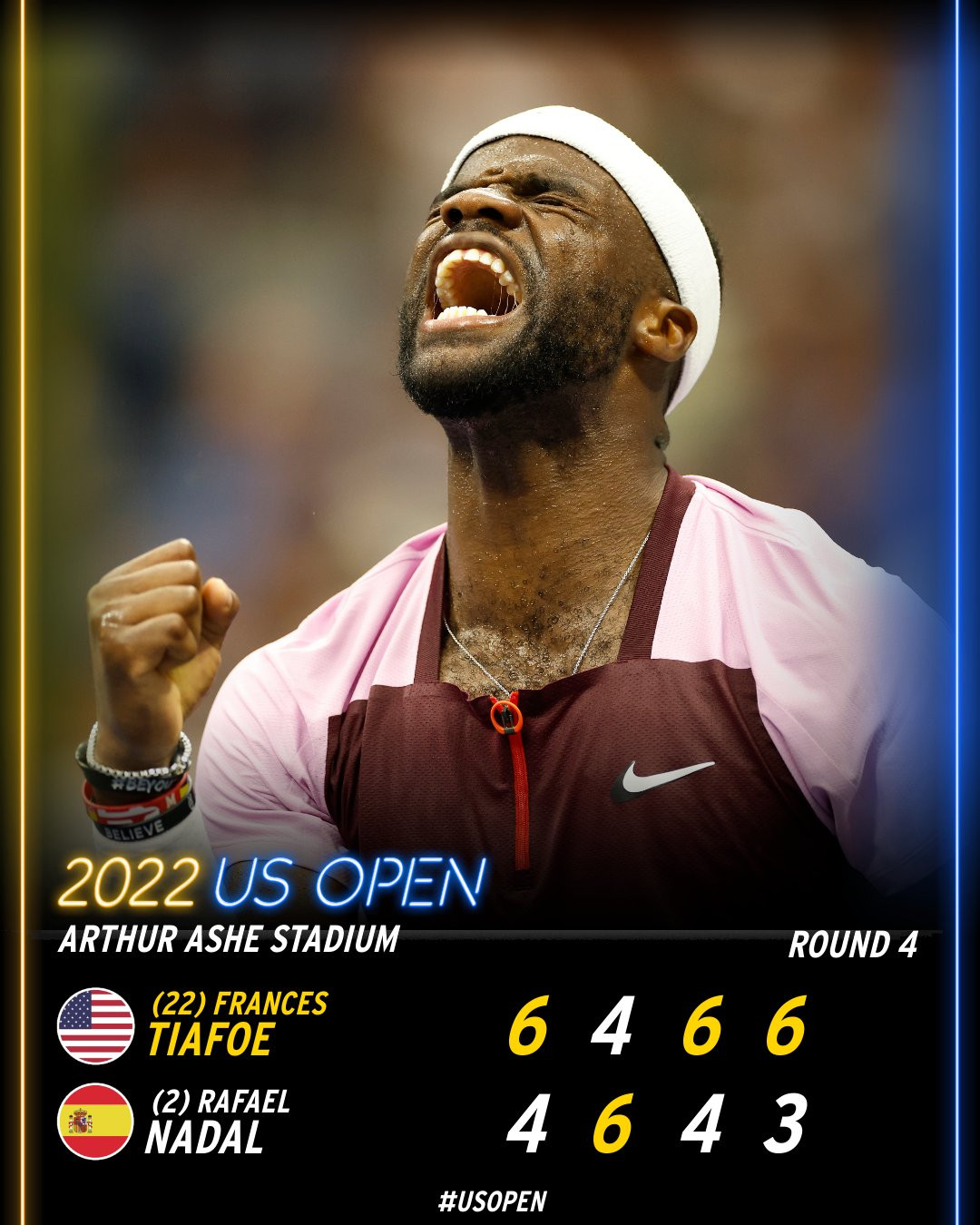 Thua 1-3 (4-6, 6-4, 4-6 và 3-6) sau 3 giờ 32 phút thi đấu, Nadal bỏ lỡ cơ hội giành danh hiệu Grand Slam thứ 23Hạt giống số 22 Frances Tiafoe tạo cơn địa chấn lớn nhất nội dung đơn nam khi hạ Nadal với tỷ số 6-4, 4-6, 6-4 và 6-3Tay vợt nước chủ nhà xúc động với chiến tích trước NadalFrances Tiafoe ăn mừng đầy phấn khíchFrances Tiafoe không cầm được những giọt nước mắtTiafoe trở thành tay vợt đầu tiên đánh bại Nadal tại một giải Grand Slam trong năm 2022Không những vậy, Frances Tiafoe còn trở thành tay vợt người Mỹ trẻ nhất vào tới vòng tứ kết Mỹ mở rộng, kể từ Andy Roddick năm 2004. Đối thủ của Tiafoe ở vòng đấu dành cho 8 tay vợt mạnh nhất là hạt giống số 9 Andrey Rublev