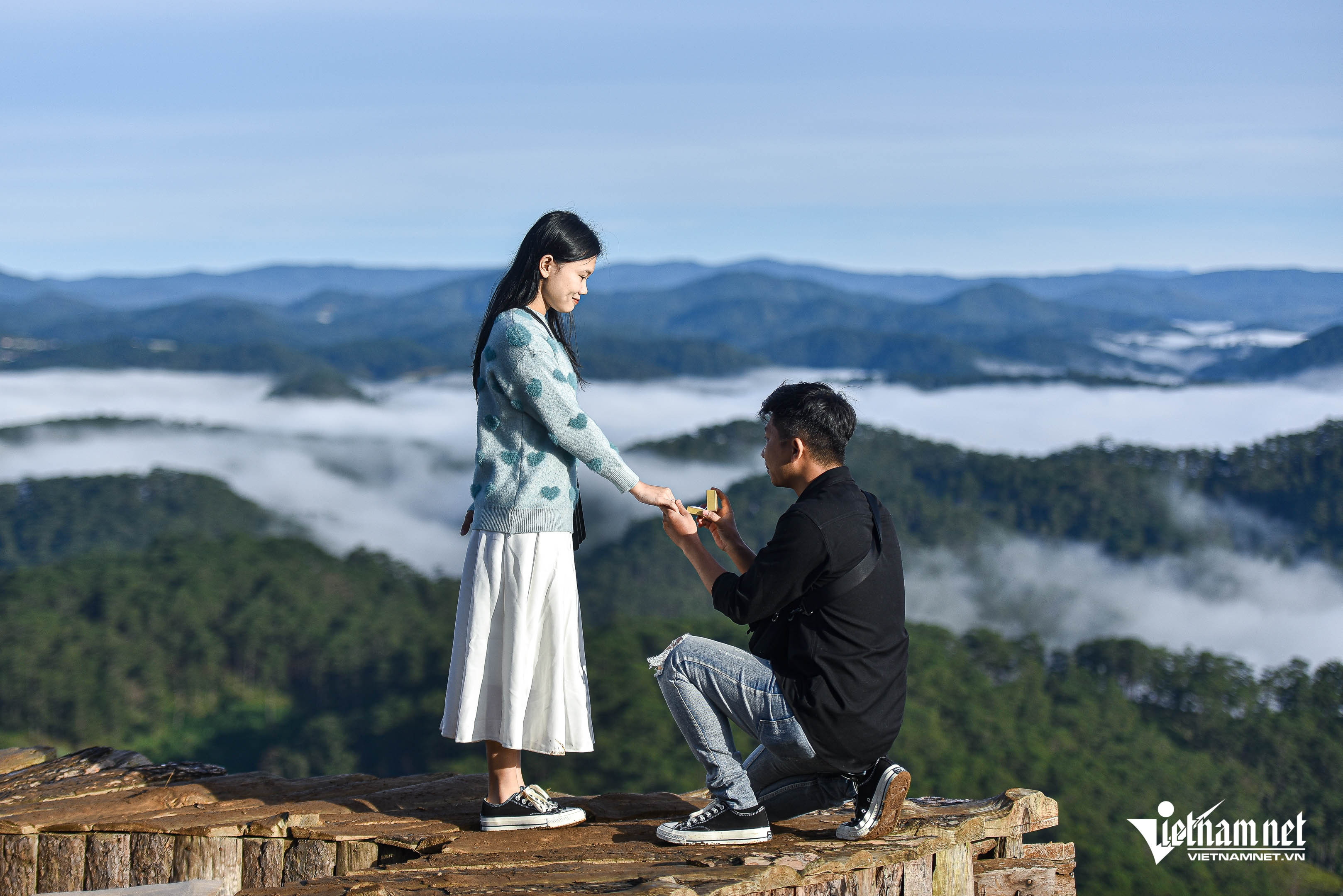 Chiếc cầu gỗ hướng ra biển mây trôi lững lờ, bao trọn những ngọn đồi, thung lũng là bối cảnh chụp ảnh cưới được rất nhiều cặp đôi ưa thích. Ngay cả trong những ngày mùa đông lạnh buốt, không ít cặp đôi vẫn vượt rét, thậm chí... choàng chăn bông tìm tới đây check-in sống ảo bên biển mây.