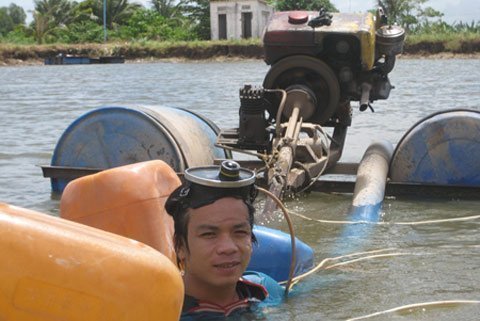 Bốn cái máy hút bùn to đùng cứ trôi lững lờ hết từ đầu ao này đến đầu ao kia; tiếng nước lủm bủm của những người thợ lặn thở ra từ dưới đáy ao hết sức nhịp nhàng, đều đặn. Ngồi trên bờ ao, ông Năm Tửng chia sẻ về nghề: “Cái nghề này coi vậy mà khó nhai lắm! Người có sức khỏe hết sức dẻo dai mới bám trụ được với nghề”.