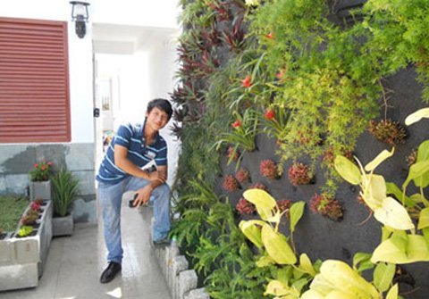 | Anh Tùng bên sản phẩm của mình, khu vườn trên tường tại nhà anh Thao, khu Định Công Thượng, Hà Nội |