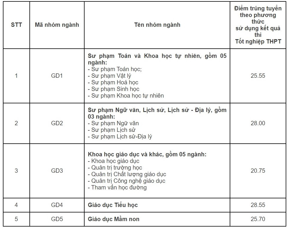 Theo đó, điểm chuẩn trúng tuyển theo phương thức xét kết quả thi tốt nghiệp THPT năm 2022 vào Trường ĐH Giáo dục - ĐH Quốc gia Hà Nội cao nhất là 28,55 điểm, thuộc ngành GD4 (Giáo dục Tiểu học). Đây cũng là điểm trúng tuyển cao nhất của trường từ trước đến nay.