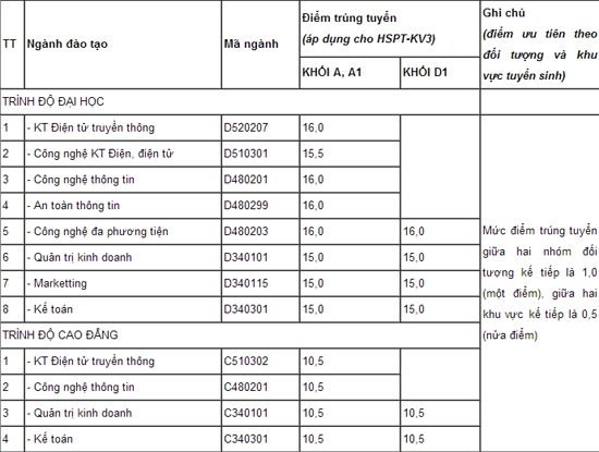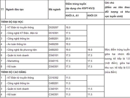 Cụ thể, tại cơ sở đào tạo Hà Nội, mức điểm chuẩn cao nhất, 20 điểm, là mức điểm trúng tuyển của các thí sinh dự thi khối A, A1 vào ngành CNTT. Điểm trúng tuyển nguyện vọng 1 vào các ngành An toàn thông tin (khối A, A1) và Công nghệ đa phương tiện (khối A, A1, D1) đều là 19 điểm. Mức điểm 17,5 là mức điểm trúng tuyển của các thí sinh thi khối A, A1 vào ngành Công nghệ kỹ thuật điện - điện tử; và thí sinh dự thi ở cả 3 khối A, A1, D1 vào các ngành: Quản trị kinh doanh, Marketing, Kế toán.