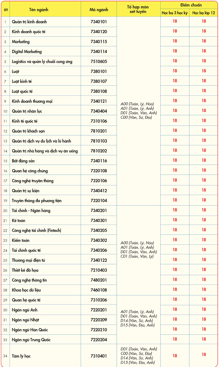 Đối với cả hai phương thức xét tuyển học bạ THPT gồm xét tuyển học bạ theo tổng điểm trung bình 3 học kỳ (học kỳ 1, học kỳ 2 lớp 11 và học kỳ 1 lớp 12); xét tuyển học bạ theo tổng điểm trung bình 3 môn năm lớp 12 có mức điểm chuẩn là 18 ở tất cả các ngành.