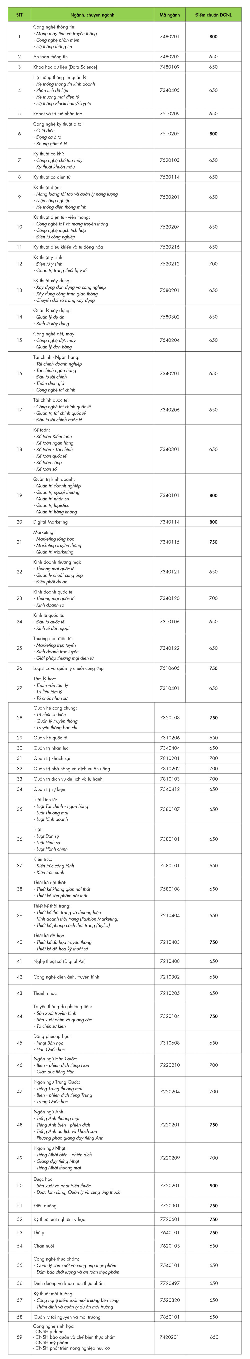 Cụ thể, ngành Dược học có mức điểm chuẩn cao nhất là 900 điểm. Các ngành khác có điểm chuẩn cao là Quản trị kinh doanh, Digital Marketing, Công nghệ thông tin, Công nghệ kỹ thuật ô tô với 800 điểm; Thiết kế đồ họa, Ngôn ngữ Anh, Truyền thông đa phương tiện, Quan hệ công chúng, Marketing, Logistics và quản lý chuỗi cung ứng, Thú y, Điều dưỡng, Kỹ thuật xét nghiệm y học với 750 điểm.
