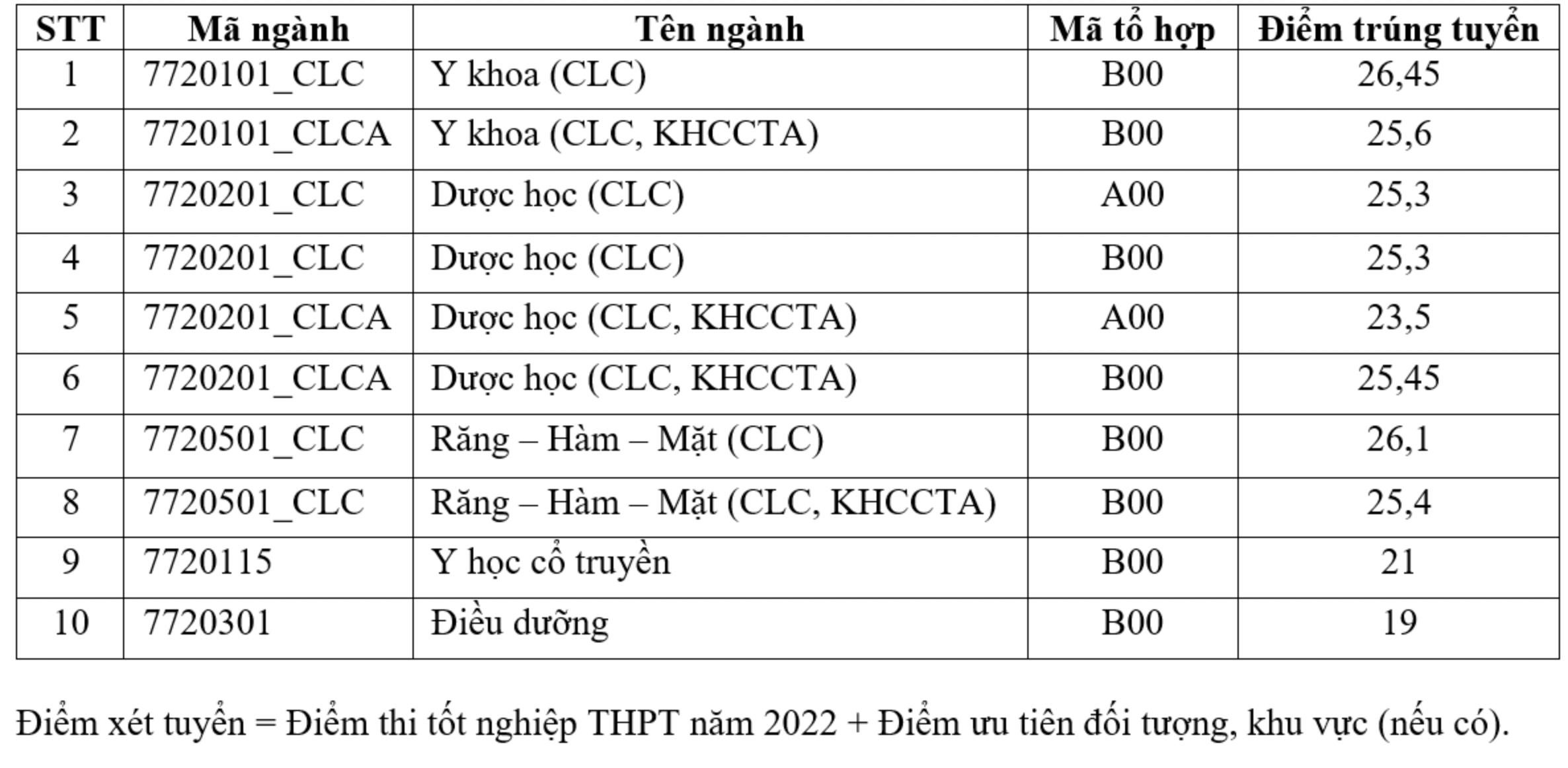 Riêng ngành Y khoa (chất lượng cao) có điểm chuẩn 26,45 (phương thức xét điểm thi tốt nghiệp THPT) và 25,6 (phương thức kết hợp chứng chỉ tiếng Anh) là cao nhất.