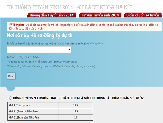 Kết quả sơ tuyển Đại học năm 2014 vừa được Hội đồng tuyển sinh trường Đại học Bách khoa Hà Nội chính thức công bố chiều qua (17/3/2014). Việc tổ chức vòng sơ tuyển các thí sinh dựa trên kết quả học tập THPT trước khi thu hồ sơ đăng ký dự thi là một điểm mới trong công tác tuyển sinh hệ Đại học chính quy của trường Đại học Bách khoa Hà Nội năm 2014.