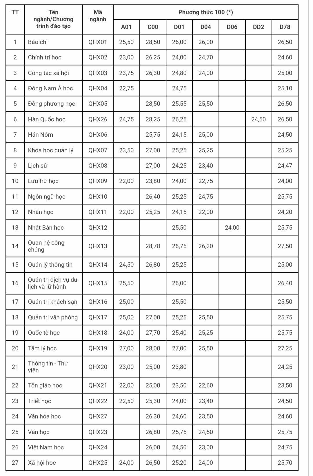 Ngành Quan hệ công chúng xét theo tổ hợp C00 lấy cao nhất với 28,75 điểm; ngành Đông phương học và Báo chí xét theo tổ hợp C00 lấy 28,5 điểm; ngành Tâm lý học xét theo tổ hợp C00 lấy 28 điểm.