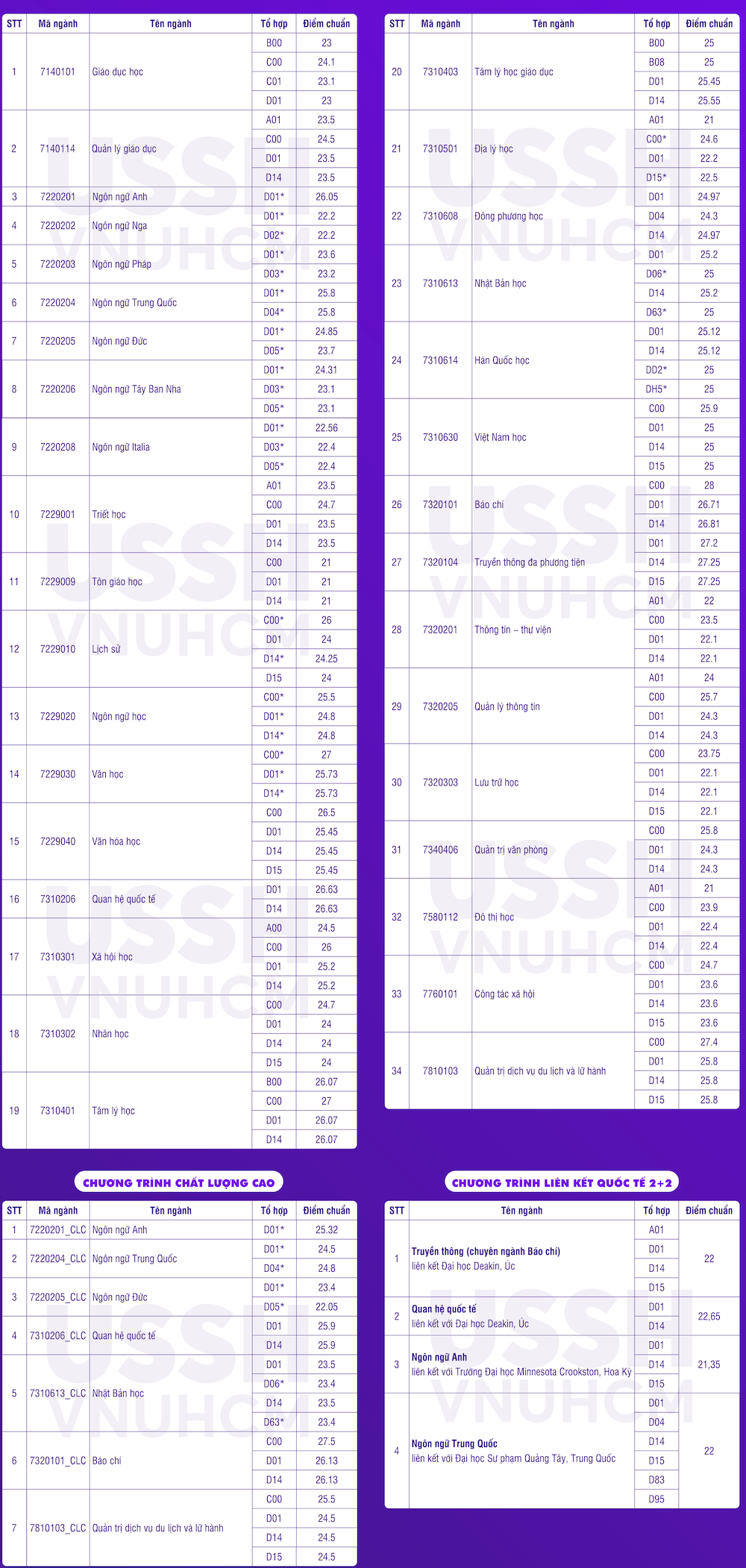 Trong đó, 10 ngành có điểm chuẩn cao nhất là: Báo chí, Quản trị dịch vụ du lịch và lữ hành, Truyền thông đa phương tiện, Tâm lý học, Quản lý thông tin, Quản trị văn phòng, Quan hệ quốc tế, Ngôn ngữ Anh, Nhật Bản học, Việt Nam học. Ngành Báo chí xét tổ hợp C00 có điểm trúng tuyển cao nhất với 28,25 điểm.
