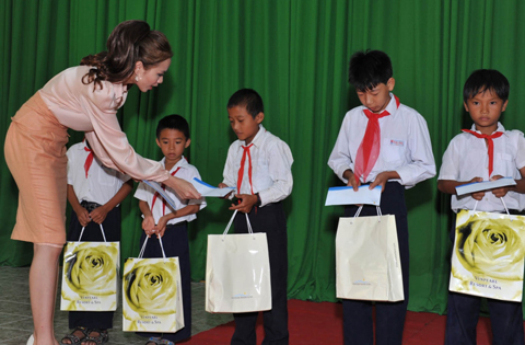 Diễm Hương trao các phần quà cho các em nhỏ.