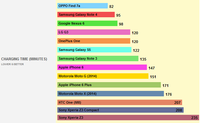 Không quá bất ngờ, chiếc OPPO Find 7/ 7A là smartphone đứng đầu danh sách, điện thoại này không bán rộng rãi trên nhiều thị trường, chủ yếu hãng OPPO bán nội địa và một số thị trường Châu Á, Việt Nam là một thị trường tiềm năng. Trên OPPO Find 7 sử dụng công nghệ riêng có tên VOOC vẫn dựa trên chip Qualcomm sản xuất. Với công nghệ này chiếc điện thoại có thể sạc nhanh mất 30 phút thời lượng pin đạt 75%, người dùng mất có 1 giờ 20 phút đợi pin sạc đầy.