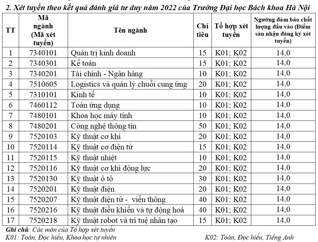 + Xét tuyển theo kết quả thi đánh giá tư duy của Trường ĐH Bách khoa Hà Nội.