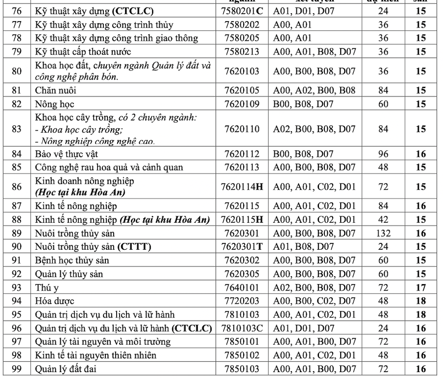 Các mã ngành Học tại khu Hòa An (Mã ngành có chữ H): sinh viên chỉ học tại Khu Hòa An vào năm thứ 2 và năm thứ 3; những năm còn lại học tại Cần Thơ.