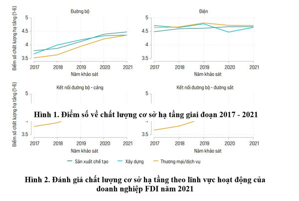 Các doanh nghiệp FDI tiếp tục đánh giá cao về lĩnh vực điện năng, trong đó các doanh nghiệp trong lĩnh vực dịch vụ, thương mại có đánh giá tích cực nhất cho yếu tố hạ tầng thiết yếu với hoạt động sản xuất kinh doanh này. Điện (4,69) và điện thoại (4,69) trên thang điểm 6, là hai lĩnh vực được các doanh nghiệp FDI đánh giá cao nhất trong năm 2021, đây cũng là hai lĩnh vực nhận được sự đánh giá tích cực của các doanh nghiệp trong nhiều năm qua.