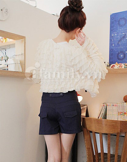 Thiết kế thường thấy nhất hè này là chiếc quần short được may thêm lớp vải phía trước, giống hệt chân váy. Hoặc cầu kỳ, tinh tế hơn là thêm những họa tiết trang trí như chiếc nơ to bản đính bên hông quần, nhằm che đũng quần. Những đường xếp ly, bèo xinh xắn, tạo cho chiếc quần vẻ mềm mại, ngọt ngào.