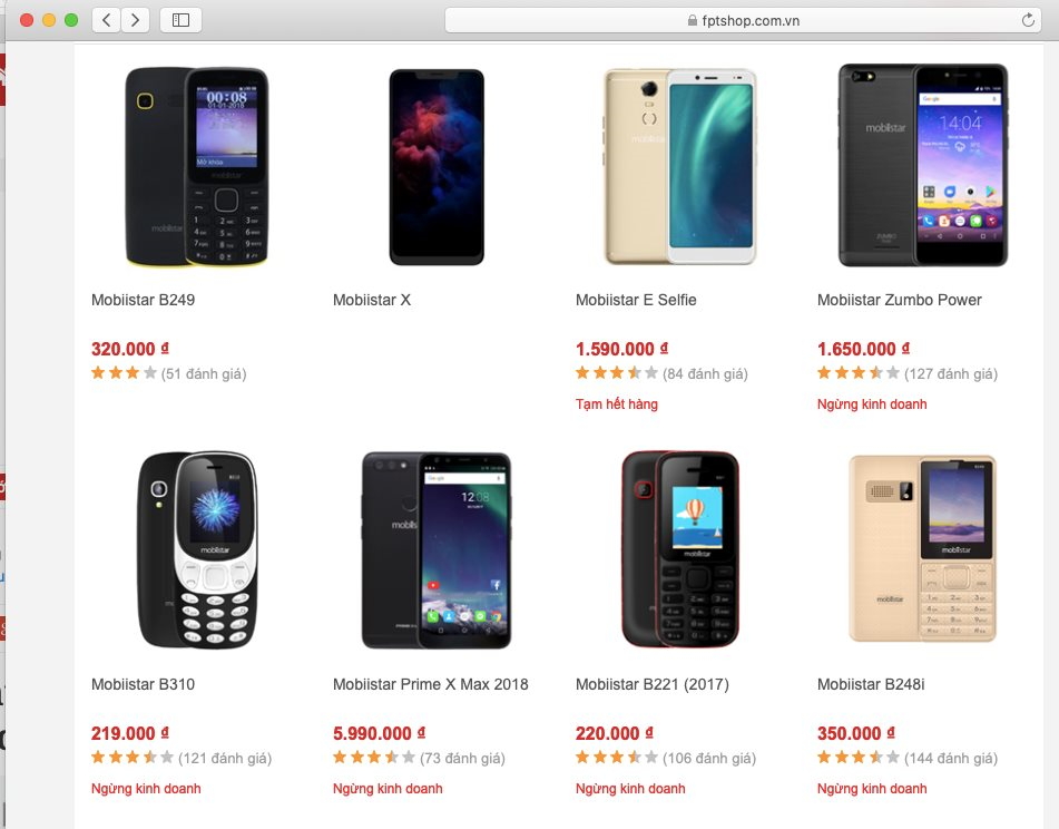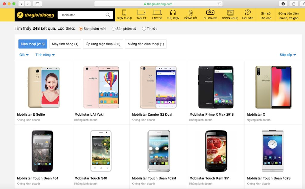 Thế Giới Di Động, FPT Shop, Viettel Store đều đã gỡ tên Mobiistar ra khỏi danh sách thương hiệu điện thoại đang bán của các chuỗi này. Khi nhấp vào ô tìm kiếm, các điện thoại của Mobiistar đều được ghi “không kinh doanh”, “ngừng kinh doanh”, “hết hàng”,...