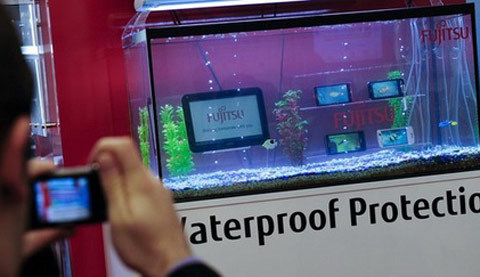 Fujitsu, hãng chiếm 1/5 thị phần điện thoại thông minh và máy tính bảng của Nhật, cũng có gian hàng lớn với các sản phẩm chống thấm.