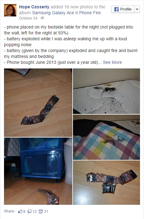 Theo lời kể của Hope Casserly trên kênh truyền hình CBC, khi đó cô đang nằm cạnh chiếc điện thoại và nhìn thấy ánh sáng phía sau vai mình. Khi cô quay lại thì thấy rằng chiếc Samsung Galaxy Ace 2 đang bốc cháy dữ dội và pin bị văng ra, đập vào tường rồi rơi xuống giường.