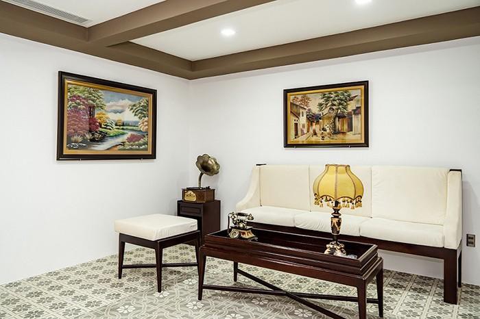 Một góc phòng giải trí đi theo phong cách cổ điển với gạch bông, điện thoại bàn và máy hát cổ.