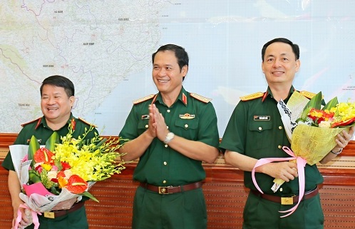 Trung tướng Vũ Hải Sản trao quyết định và chúc mừng Đại tá Trần Quốc Tiến, Đại tá Phạm Đăng Thuấn. |