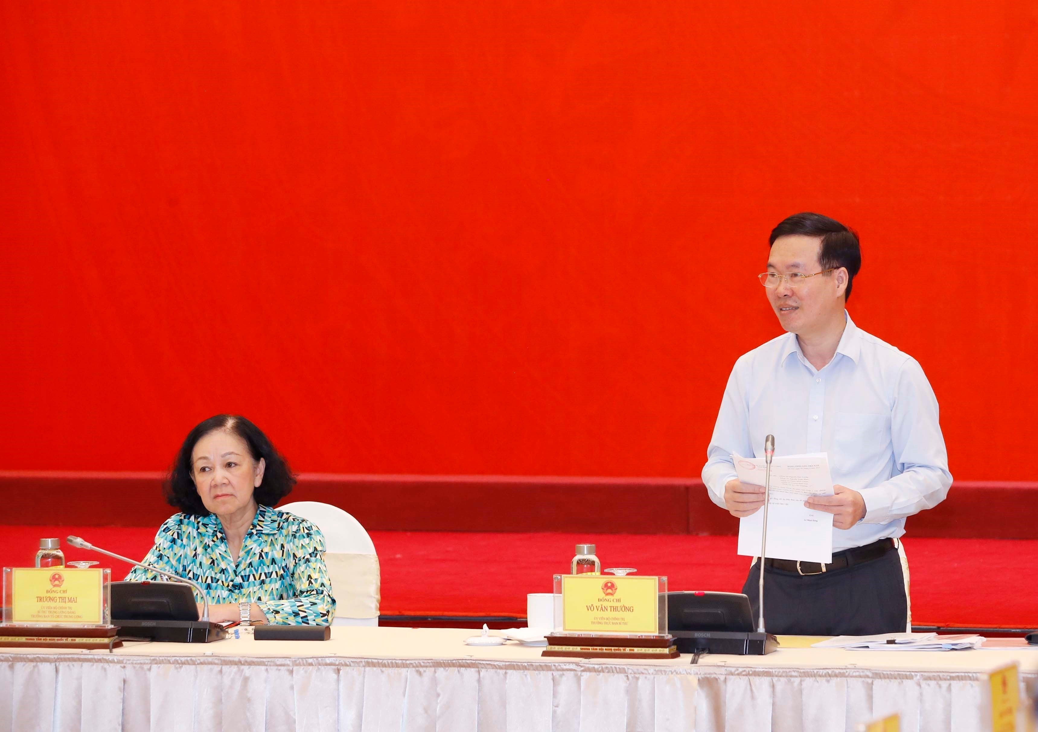 Thường trực Ban Bí thư Võ Văn Thưởng và Trưởng Ban Tổ chức Trung ương Trương Thị Mai chủ trì hội nghị. Ảnh: TTXVN