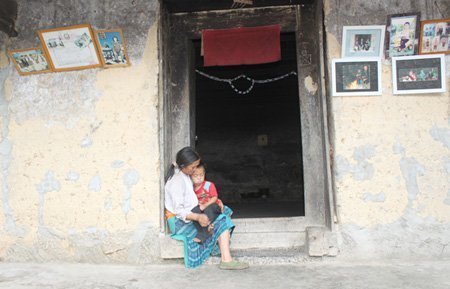 Chị Ly Thị Chúa ôm con bên bậu cửa, hình ảnh quen thuộc của phụ nữ người Mông |