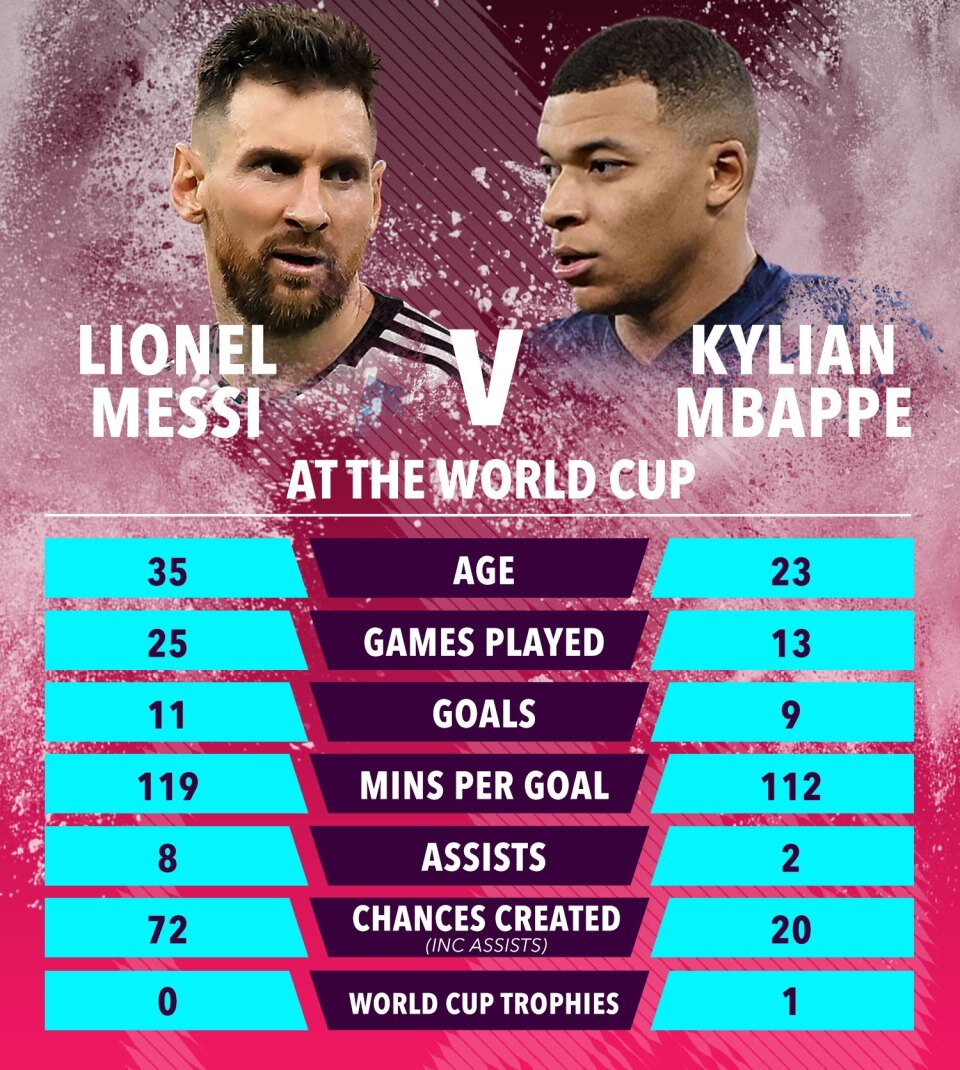 Lionel Messi nhiều hơn Mbappe 12 tuổi nhưng có rất ít khoảng cách giữa họ tại sân chơi World Cup.