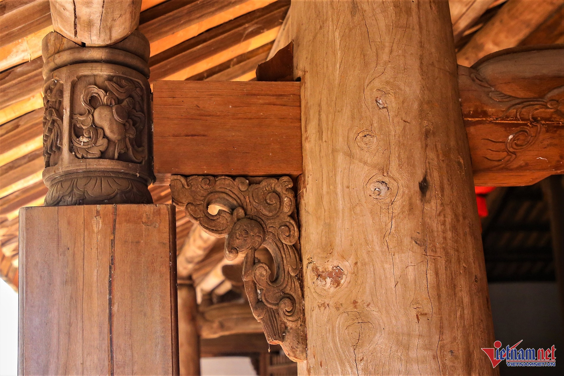 Một cột gỗ tại hiên đình được trùng tu.Mặt chính là một hàng 6 cột phân cách ngôi đình theo bố cục 3 gian 2 chái.