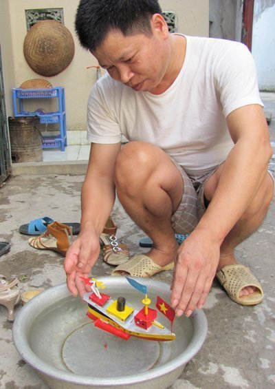 Tàu thủy sắt được làm từ những vật liệu đơn giản như vỏ hộp sữa Ông Thọ, đồng vụn, sơn tổng hợp…, một món đồ chơi xưa bị lãng quên. Tàu thủy sắt không bán ở phố Hàng Mã như các đồ chơi trung thu khác mà được bán ở phố Hàng Thiếc hay những cửa hàng lưu niệm giữa phố cổ.