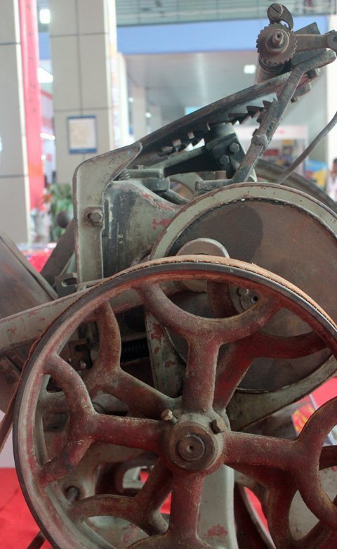 Bước vào sảnh chính trong ngày Hội chợ sách quốc tế năm nay, độc giả dễ dàng bắt gặp 2 chiếc máy in Typo lớn từ thời kháng chiến với những con chữ được xếp ngay ngắn dưới chân, 1 chiếc máy xén giấy từng được thư viện quốc gia sử dụng từ ngày đầu thành lập (1917) và một chiếc máy đánh chữ.