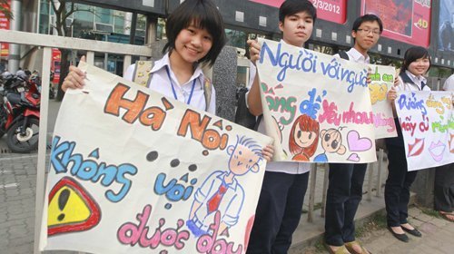 Một nhóm bạn trẻ tay cầm các khẩu hiệu dí dỏm về giao thông Hà Nội đang đứng tại