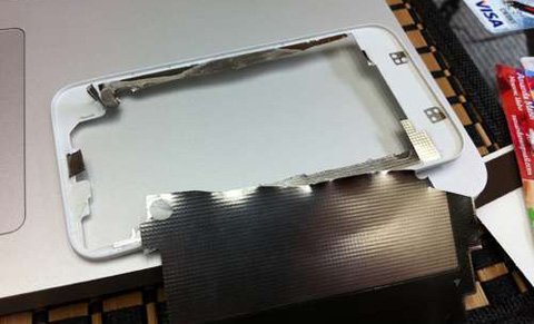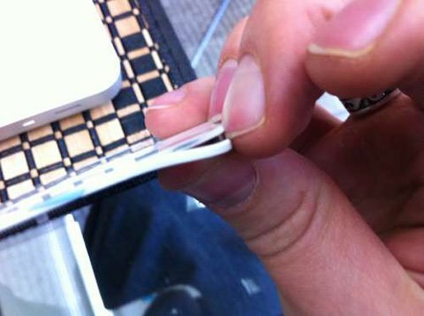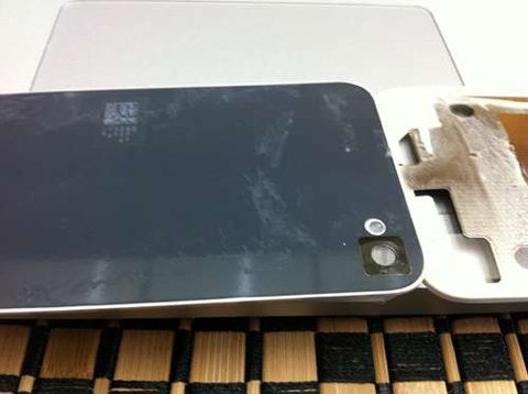 Tách miếng nhựa ra khỏi lớp kính bảo vệ của iPhone, lúc này mặt sau của chiếc iPhone 4 sẽ được chia ra làm 2 phần: Mặt kính và lớp nhựa.