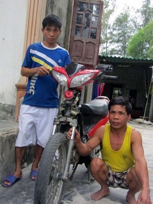 | Cha con ông Cậy bên chiếc xe bị cẩu tặc khi bỏ chạy tông phải, hư hỏng đến nay vẫn chưa có tiền để sửa. |