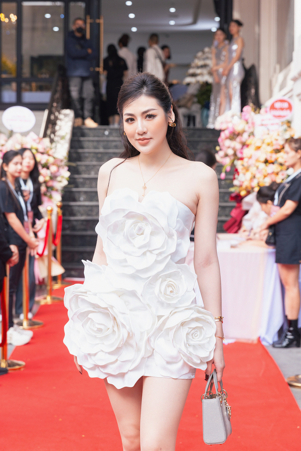 Tới chúc mừng Đỗ Thị Hà, hoa hậu Đỗ Mỹ Linh diện trang phục trắng nền nã. Sau khi sinh con đầu lòng, Đỗ Mỹ Linh thường diện trang phục giấu dáng.