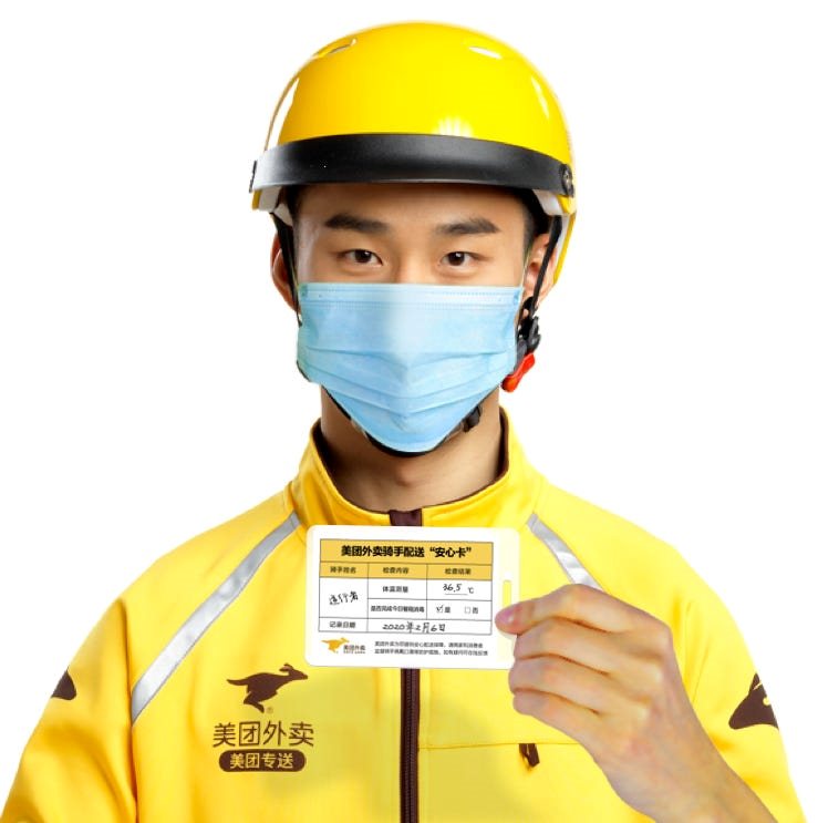 Tấm thẻ ghi tên và nhiệt độ tài xế giao hàng của Meituan. Ảnh: Meituan |