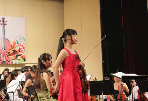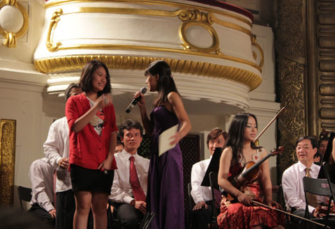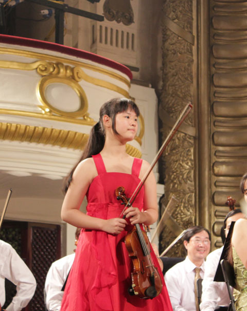 Phương Nhi 13 tuổi bên cây vĩ cầm và nhạc trưởng Honna Tetsuji