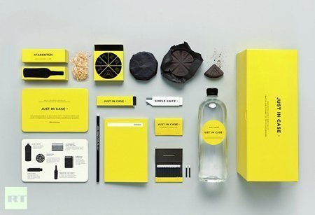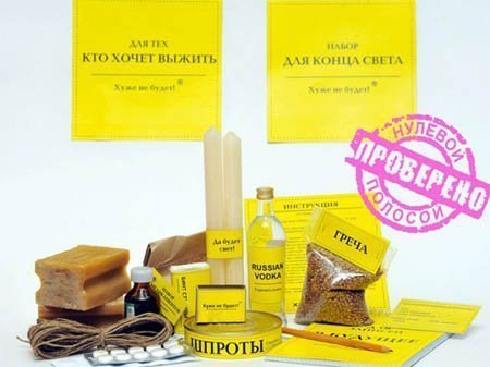 Bộ sản phẩm sinh tồn cho ngày tận thế bao gồm thuốc trợ tim, xà phòng, một vài cây nến và que diêm, một hộp cá, một gói kiều mạch, một chai vodka, một quyển sổ tay, một quản bút chì và một sợi dây.