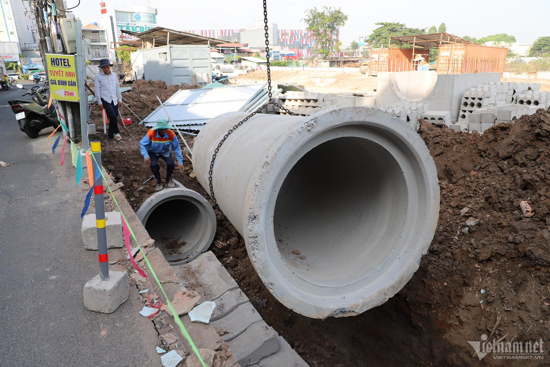Phía ngoài đường Trường Chinh- Cộng Hòa cũng rào chắn một phần đường. Nhà thầu đặt biển báo kèm theo lời xin lỗi vì làm phiền do thi công dự án.Công nhân đang thi công hạng mục thoát nước cho tuyến đường mới. Từ công trường dự án đường nối Trần Quốc Hoàn - Cộng Hòa có thể thấy máy bay cất cánh ngay trên đầu. Khu vực thi công dự án nằm khá gần đường băng của sân bay Tân Sơn Nhất. Ông Tiến (70 tuổi, người dân phường 13) cho biết, sắp tới, đường C12 hợp nhất vào đường nối Trần Quốc Hoàn- Cộng Hòa sẽ rộng gấp 6-8 lần sẽ làm thay đổi bộ mặt cuộc sống người dân. Tuyến đường hình thành sẽ giúp giảm tải kẹt xe, nhà mặt tiền trên đường được khang trang hơn do được hưởng lợi từ dự án nên ai cũng phấn khởi.