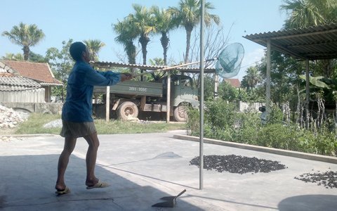 đang xúc mẻ ong bầu đã được phơi khô cho vào bao, đưa lên bàn cân để biết số