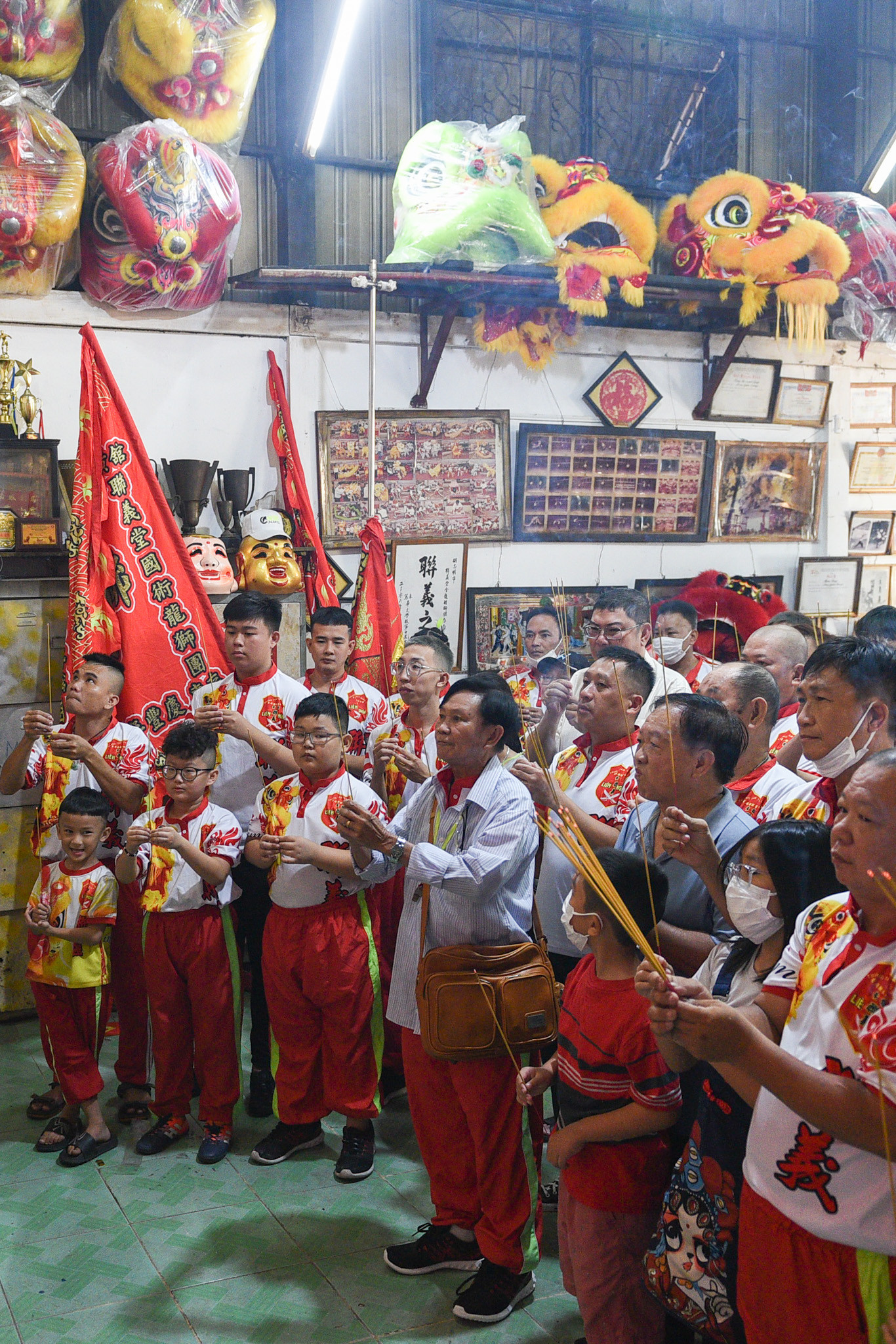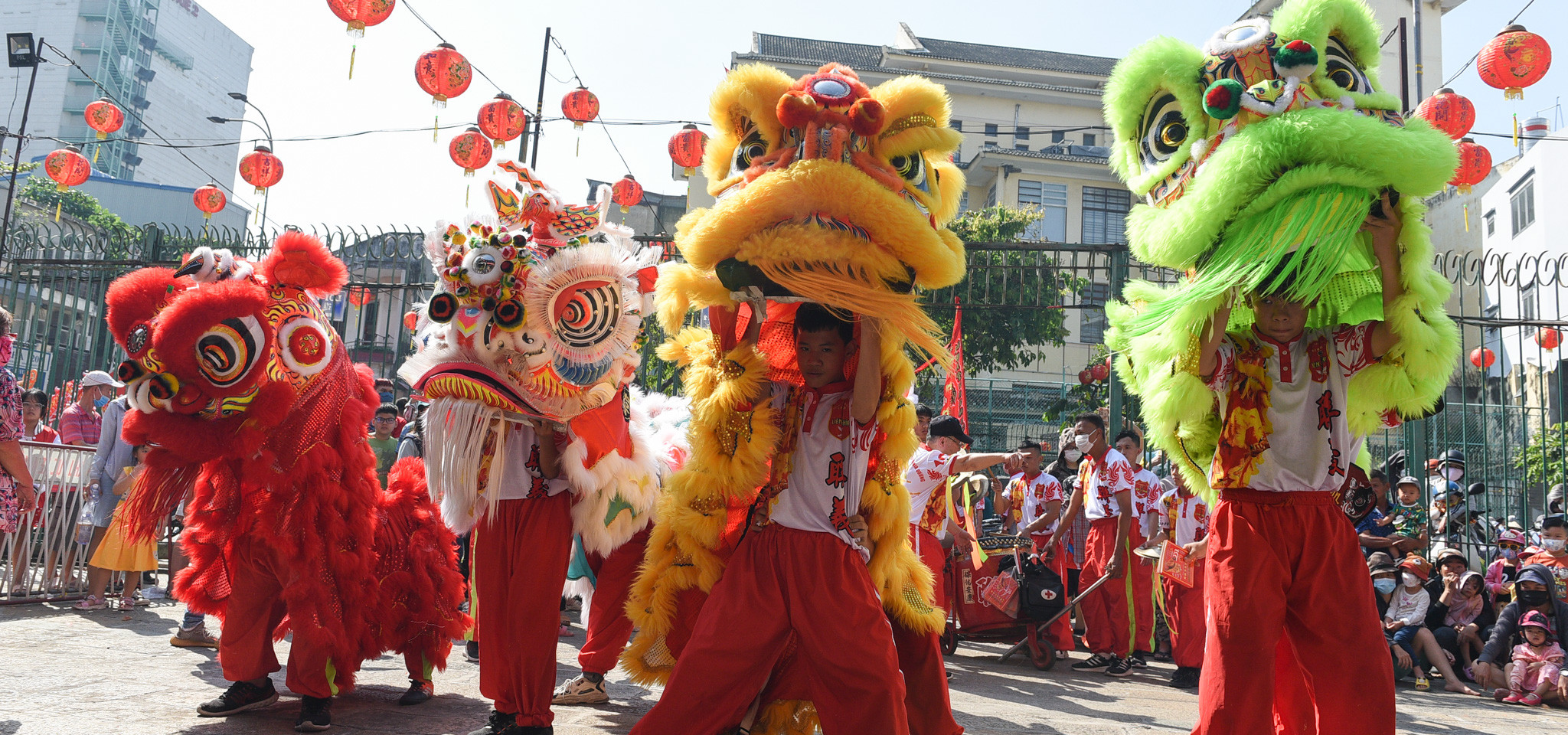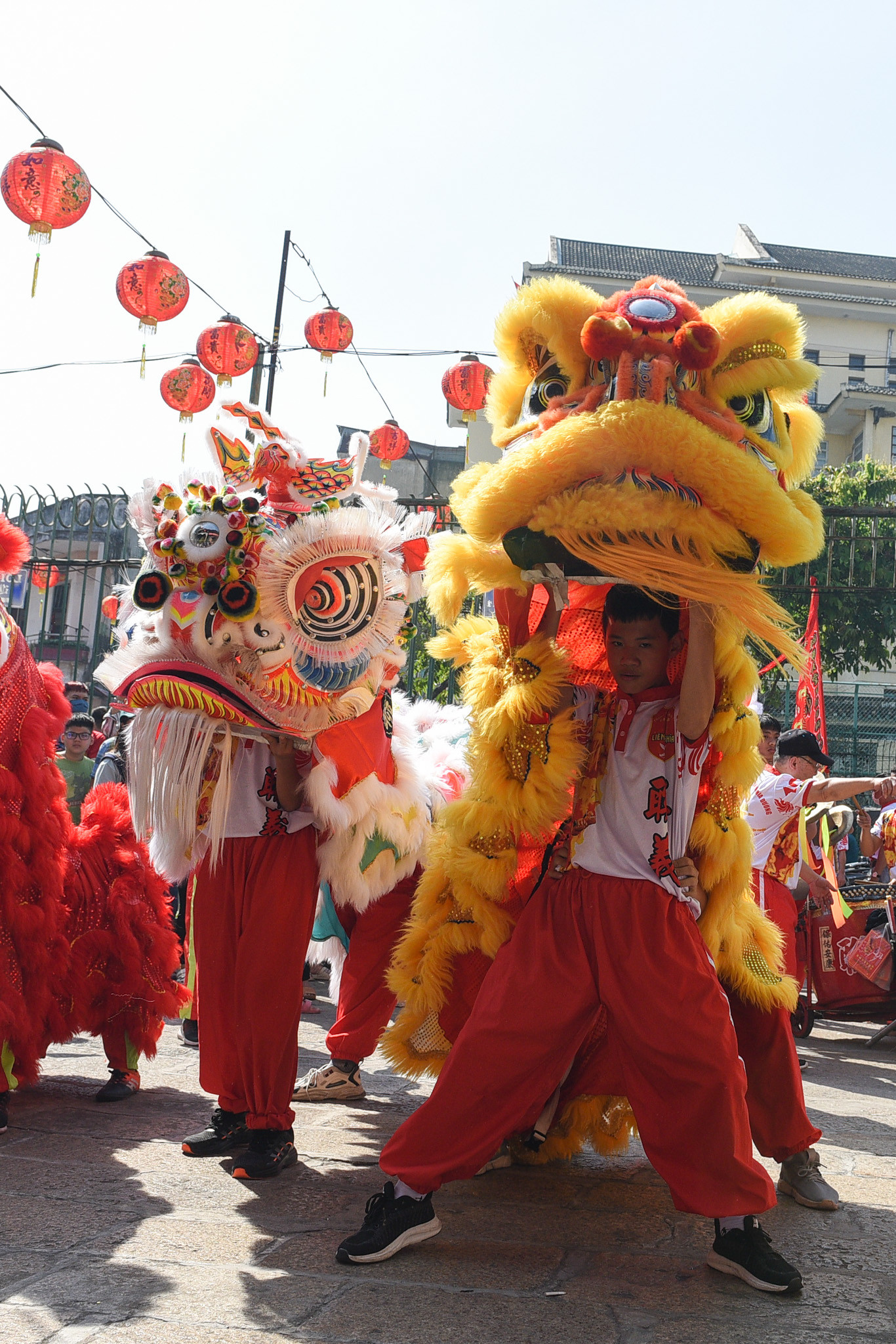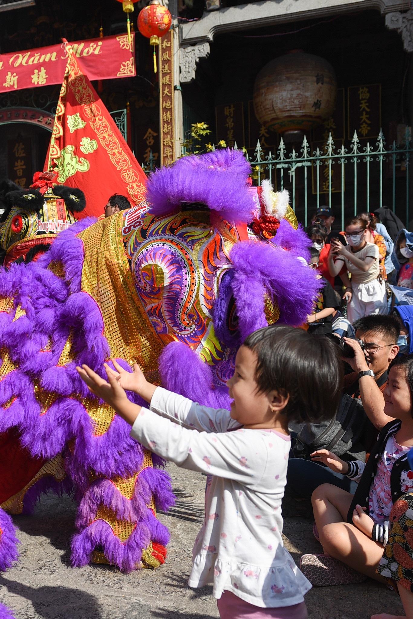 Tại Chùa Bà Thiên Hậu, một số đội lân sư rồng từ những võ quán khác cũng có mặt. Nhiều em nhỏ phấn khích trước các đầu lân sặc sỡ sắc màu.